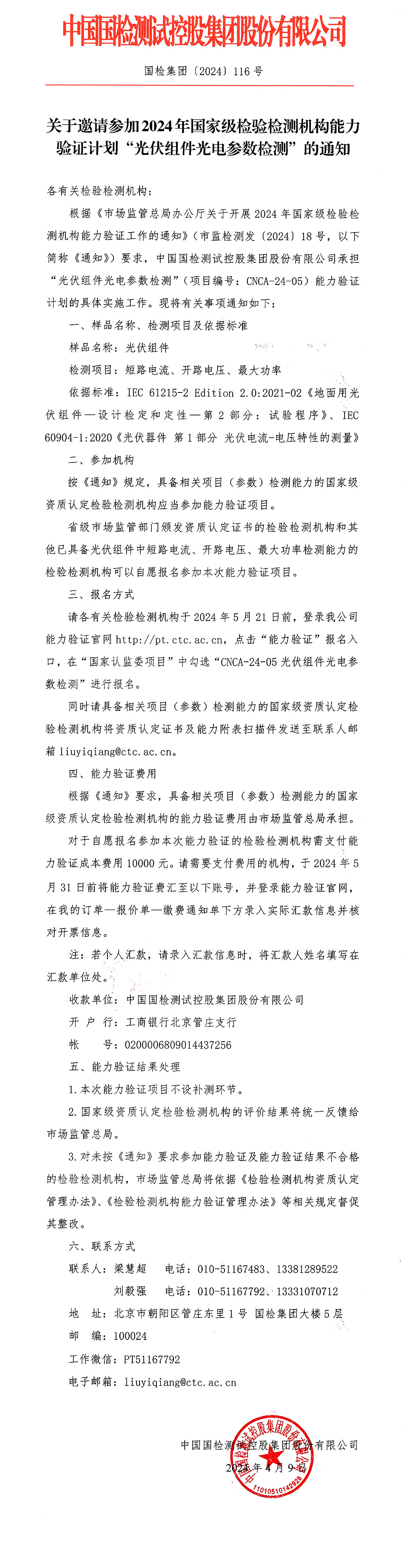 关于邀请参加2024年国家级检验检测机构能力验证计划“光伏组件光电参数检测”的通知